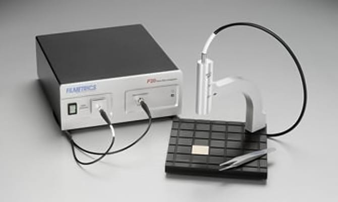 - F20 막두께 측정 시스템에서는 박막 표면 및 기판과의 계면에서의 반사광을 분광 해석함으로써 투명 혹은 반투명 박막의 막 두께, 굴절률 및 소쇠계수를 2초 정도로 간단하게 측정할 수 있습니다.